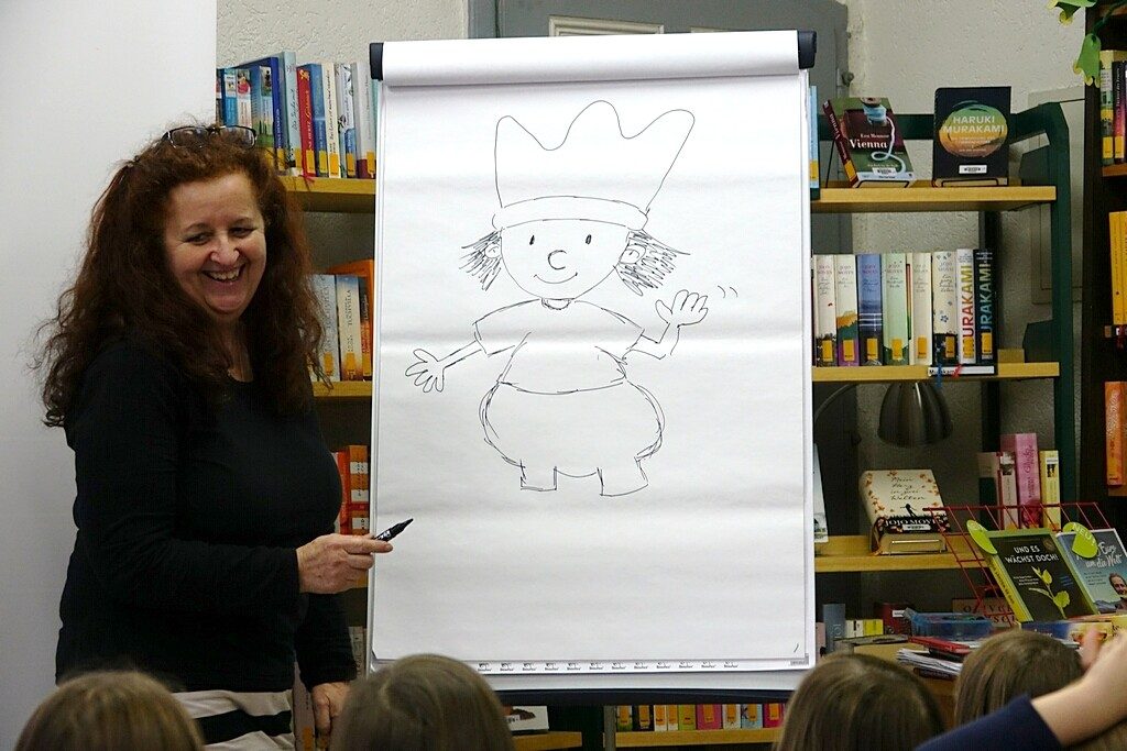 Die „Maxis“ der Kindergärten „Rasselbande“ und „In der alten Schule“ besuchten die Bücherei, wo die Autorin Hedwig Munck drei Geschichten vom „Kleinen König“ vorstellte und dabei auch viele Bilder zeigte. Hedwig Munck konnte aber nicht nur spannend lesen, sondern auch noch gut malen. Und so konnte jeder Kindergarten noch ein großes Bild mitnehmen, das sogar vom kleinen König unterschrieben war.