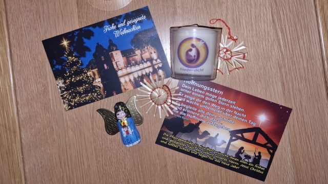 Am 3. Adventssonntag verteilte der Ortsausschuss wieder Friedenslichter. 300 Tüten mit dem Friedenslicht, einem Strohstern, einem Schokoladenengel und einer Weihnachtspostkarte der Pfarrgemeinde wurden an der Kirche abgeholt oder bei Bedarf nach Hause gebracht.