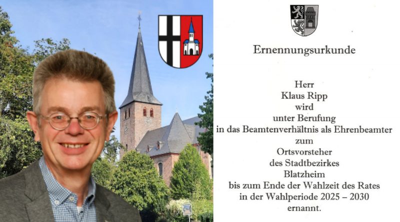 In der Ernennungsurkunde heißte es: „Herr Klaus Ripp wird unter Berufung in das Beamtenverhältnis zum Ortsvorsteher des Stadtbezirks Blatzheim bis zum Ende der Wahlperiode 2025 – 2030 ernannt“. Der Stadtbezirk Blatzheim umfasst Blatzheim, Bergerhausen, Niederbolheim und Gehöfte.
