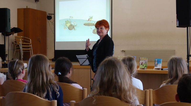 Rund 30 Kinder vom Vorschulalter bis zur 3. Klasse haben ihr Kommen zum „Lese-Erlebnis“ nicht bereit. Es war in der Tat ein Erlebnis Gerlis Zilgens zuzuhören, die mit ihrem sprachlichen Geschick die Geschichte von den Fröschen Hip und Hopp, die ihren Papa Grünsprung retteten erzählte, die sie in Anlehnung an das Märchen der Froschkönig geschrieben hatte.