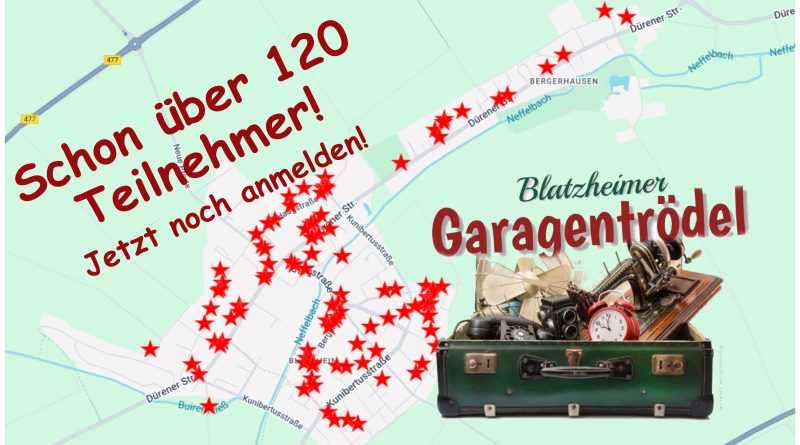 Wer noch Werbung für den Garagentrödel machen möchte, kann in der Bücherei Flyer und Plakate abholen. Online ist der Ausstellerplan hier zu finden: www.blatzheim-online.de/garragentroedel. Das DRK wird wieder eine Verpflegungsstation einrichten. Natürlich freut sich auch die Blatzheimer Gastronomie über Gäste und hier und da wird es sicher nach frischen Waffeln riechen.