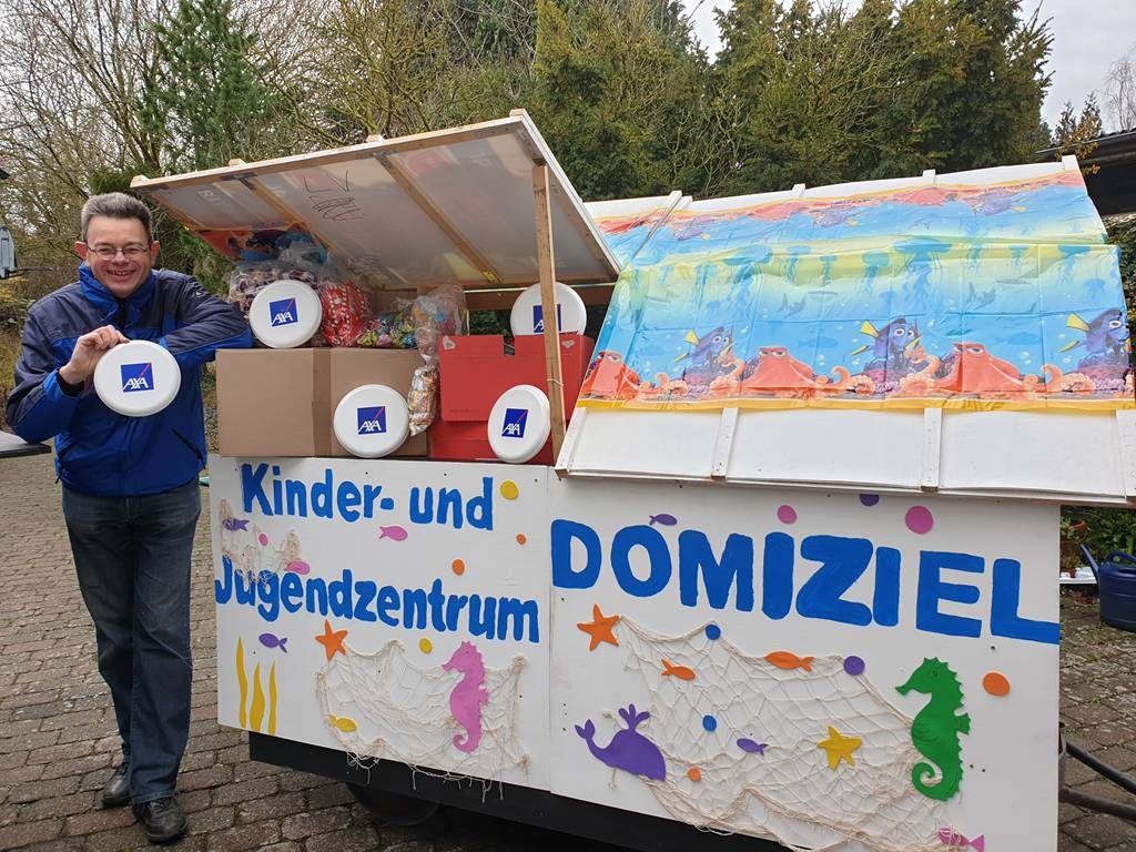 Auch in diesem Jahr unterstützt die AXA-Geschäftsstelle Schneppenheim GmbH in Blatzheim das Kinder- und Jugendzentrum DOMIZIEL wieder mit Wurfmaterial für die Teilnahme am Karnevalszug.