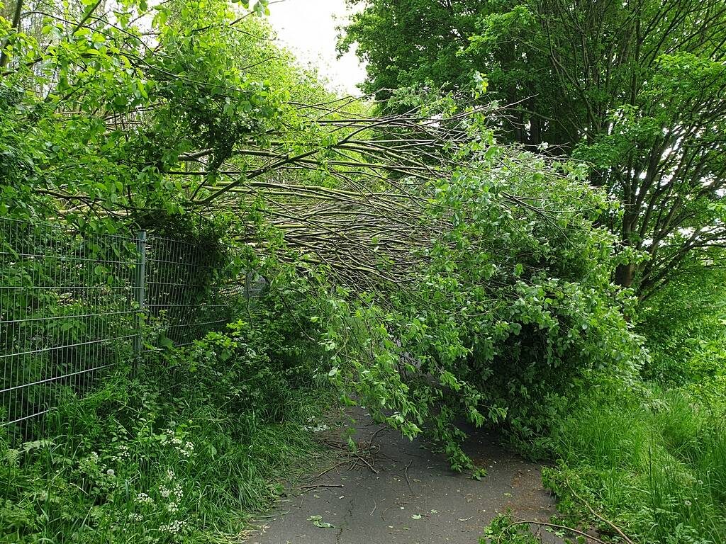 Ein umgestürzter Baum blockierte den Radweg am Neffelbach zwischen Katharinenhof und der B264. Für Radfahrer und Fußgänger war kein Durchkommen mehr.