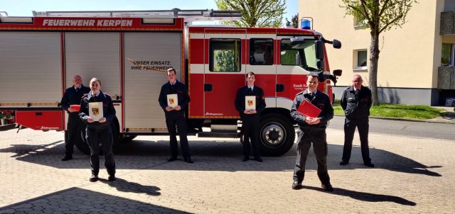 „Damit die Kameradinnen und Kameraden nicht noch länger auf Ihre Beförderungen warten müssen, haben wir am heutigen Sonntag vor dem Feuerwehrhaus eine kurze Corona-konforme Beförderung zusammen mit dem stellvertretenden Leiter der Feuerwehr Kerpen, Stadtbrandinspektor Manfred Reuter, durchgeführt. Der obligatorische kameradschaftliche Teil im Anschluss musste natürlich leider ausfallen. Aber ich denke aufgeschoben ist nicht aufgehoben und die Gelegenheit zum gemeinsamen Anstoßen wird sicher nachgeholt“, sagte Löschzugführer Daniel Eßer.