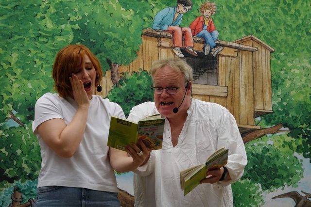 Eine solche Lesung gab es in Blatzheim noch nicht. Knapp 60 Kinderbücher sind bislang in der Serie „Das magische Baumhaus“ erschienen. Bei der „Magischen Baumhaus-Party“ stand jetzt „Der Schatz der Piraten“ auf dem Programm. Und hier wurde nicht vorgelesen, sondern vorgelesen und vorgespielt. So zogen die beiden Schauspieler Laura Mann aus Süddeutschland und Stephan Bach aus Norddeutschland rund 70 Kinder im Kunibertus-Haus in ihren Bann und sorgten für Spannung. Und die passenden Geräusche zu den Szenen steuerten dann die Kinder bei. Da macht Lesen gleich noch mehr Freude.