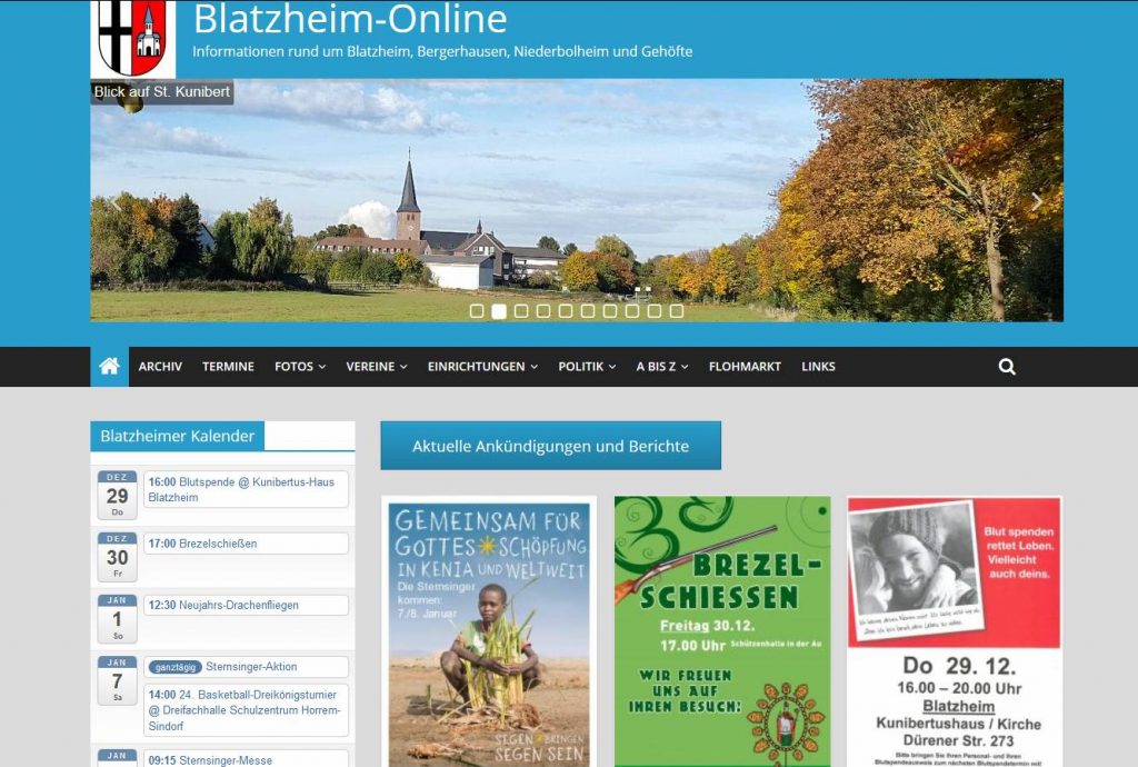Seit dem 01.10.1999 berichtet www.kerpen-blatzheim.de über (fast) alles, was rund um Blatzheim, Bergerhausen, Niederbolheim und Gehöfte geschieht. Normalerweise werden jeden Sonntag-Abend die neuesten Meldungen der Woche ins Internet gestellt.