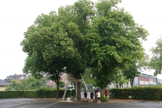 Unter Anleitung von Katrin Kleinau und Eik Niemann von der Kölner Bildhauerei haben die 8 Jungen und 10 Mädchen gesägt, geschnitzt, geraspelt, geschmirgelt und aus „einfachen“ Holzstücken kleine Kunstwerke entworfen. Die Holzstücke wurden mitgebracht oder bei einem Gang durch den Park der Burg Bergerhausen gefunden. Die kleinen Kunstwerke wurden dann in Anlehnung an einem „Totem“ am „Blatzheimer Kraftbaum“ angebracht.
