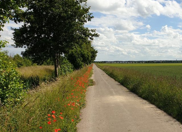 Die Randstreifen der Wirtschaftswege (Wegraine) sind meistens mit Gras bewachsen. Sie müssen insbesondere für die Landwirtschaft überfahrbar sein, wenn sich auf den schmalen Feldwegen zwei Fahrzeuge begegnen. Hin und wieder „verirren“ sich auch ein paar Wildblumen dort.