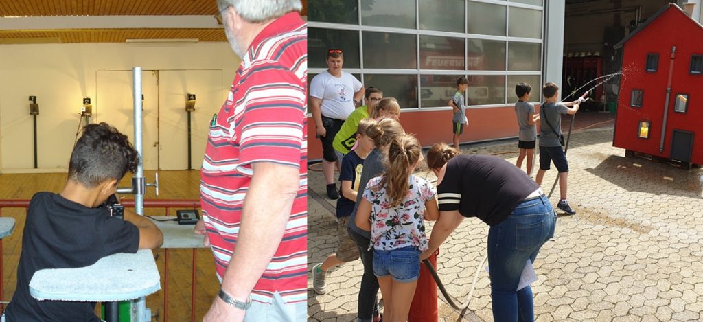 Heute durften die Kinder in der Schützenhalle mit dem Lasergewehr ihre Treffsicherheit unter Beweis stellen. Bei der Rallye letzte Woche konnten sie mit dem Wasserschlauch versuchen, die Fenster eines Hauses zu öffnen. Beide Aktionen haben den Kindern viel Spaß gemacht.