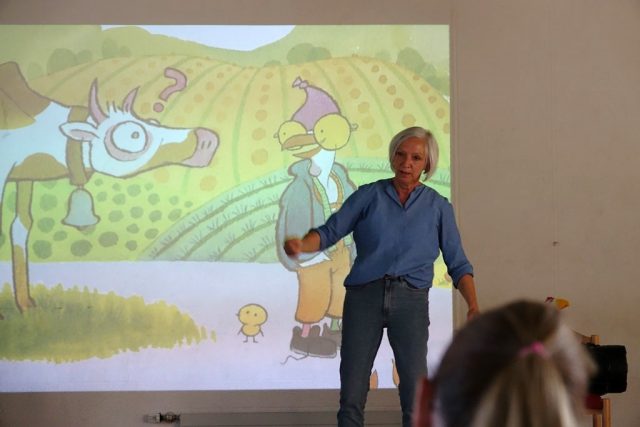 Die bekannte Stimme des Burgfräuleins Bö aus Ritter Rost war nach 2016 zum zweiten Mal auf Einladung der „Buchstützen Blatzheim“ und der KÖB-St. Kunibert im Kunibertus-Haus. Diesmal erzählte Patricia Prawit die Geschichte aus dem Bilderbuch „Das RAP-Huhn“.