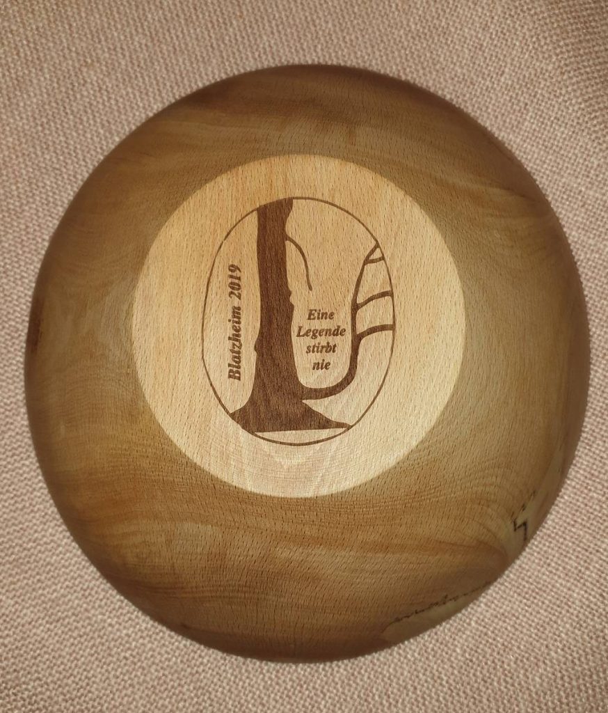 Nun hat Franz Weingarten aus dem Holz des Rüssels einige Schalen gedrechselt. Auf der Unterseite steht: „Eine Legende stirbt nie“.