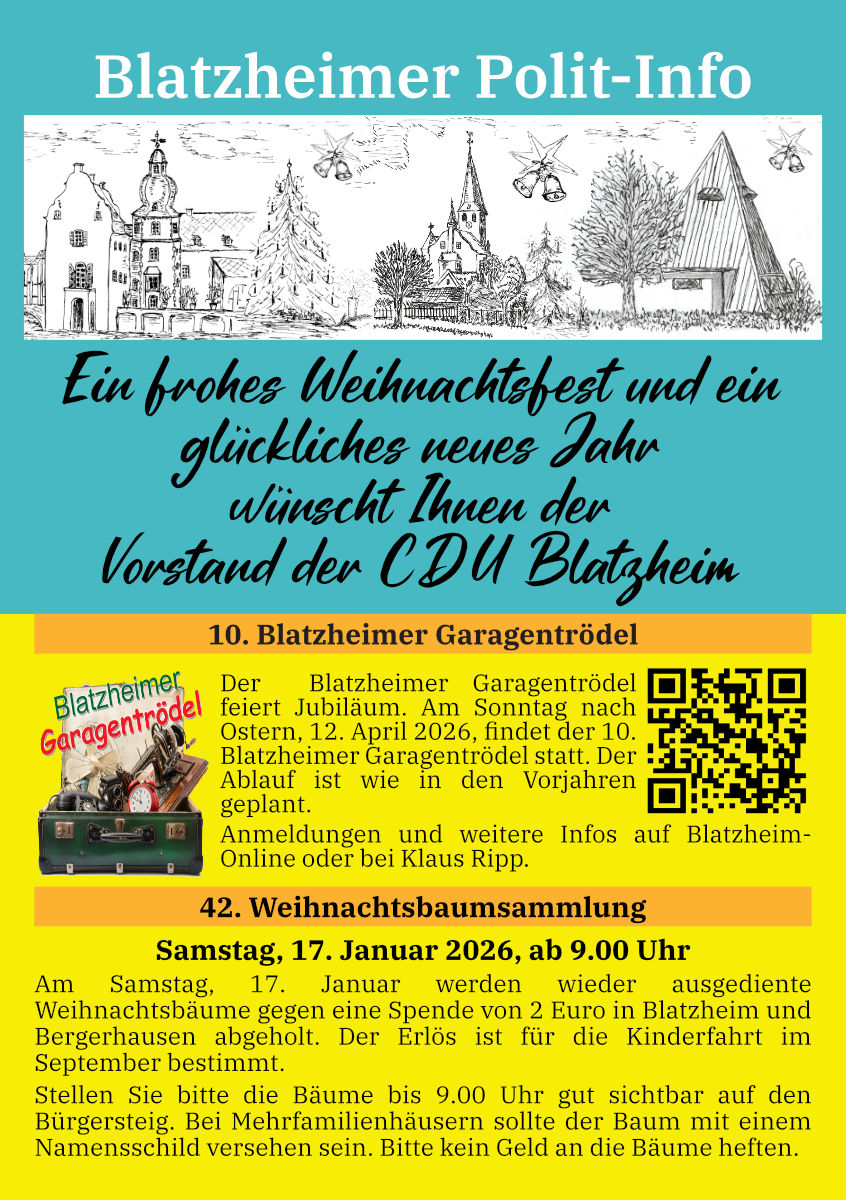 Zudem wünscht die CDU-Blatzheim ein frohes Weihnachtsfest und ein frohes neues Jahr 2026.