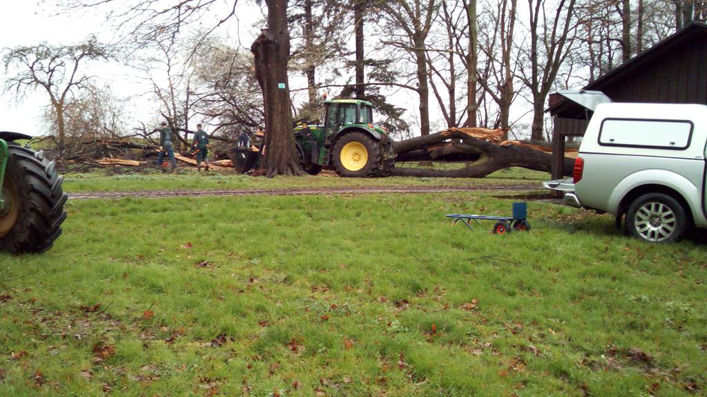 (FraPeDo) Mit starken Windböen ist Sturm “Eberhard” am Sonntag, 11. März 2019, über Blatzheim hinweggezogen und hat zahlreiche Schäden an Gebäuden und in der Natur hinterlassen. Besonders betroffen war der Schlosspark, wo zwischen Bergerhausen und Blatzheim mehrere wertvolle alte Bäume entwurzelt wurden, was schon insoweit ungewöhnlich ist, als die Bäume zur Zeit unbelaubt sind und somit den starken Winden nur wenig Angriffsfläche bieten. Mitarbeiter der Eigentümerfamilie sind seit Tagen mit den Aufräumarbeiten beschäftigt.