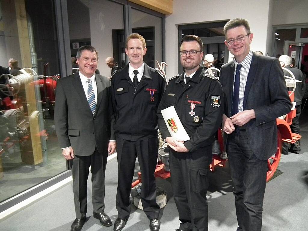 David Dohmen und Pascal Hark wurden für 25-jährige aktive Mitgliedschaft in der Feuerwehr mit dem silbernen Verdienstorden ausgezeichnet. Während Pascal Hark derzeit beruflich im Ausland ist, konnte David Dohmen Urkunde und Ehrennadel von Bürgermeister Dieter Spürck und Stadtbrandmeister Wolfgang Graß entgegennehmen.