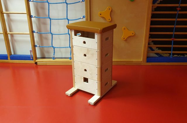 Der Kindergarten Rasselbande kann sich über einen neuen „Maxi-Sprungkasten“ freuen, den jetzt die Pfarrgemeinde St. Kunibert gespendet hat.