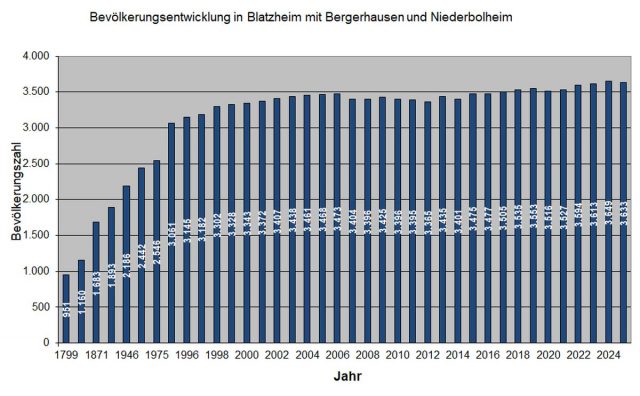 Zum 31.12.2025 lebten in Blatzheim mit Bergerhausen, Niederbolheim und Gehöfte (Geilrath, Dorsfeld, Klarahof, Gut Seelrath, Clemenshöfe, Gut Giffelsberg, Gut Onnau, Katharinenhof) 3.633 Personen; 16 weniger als Ende 2025.