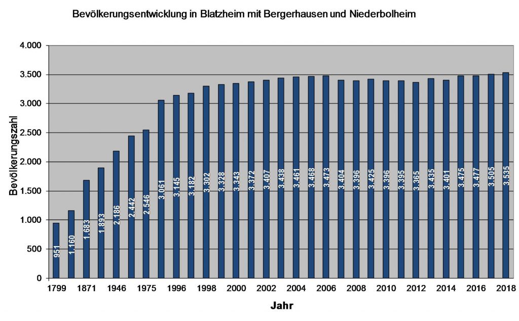 Im Jahr 2018 ist die Bevölkerungszahl weiter gestiegen. Zum 31.12.2018 lebten in Blatzheim mit Bergerhausen, Niederbolheim und Gehöfte (Geilrath, Dorsfeld, Klarahof, Gut Seelrath, Clemenshöfe, Gut Giffelsberg, Gut Onnau, Katharinenhof) 3.535 Personen; 30 mehr als Ende 2017.