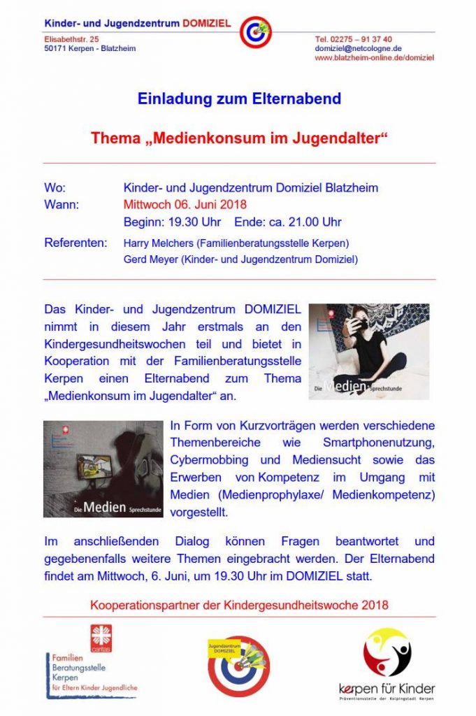 Das Kinder- und Jugendzentrum DOMIZIEL nimmt in diesem Jahr erstmals an den Kindergesundheitswochen teil und bietet in Kooperation mit der Familienberatungsstelle der Caritas in Kerpen einen Elternabend zum Thema „Medienkonsum im Jugendalter“ an.