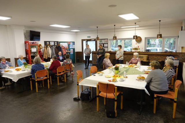 Lange haben die Seniorinnen und Senioren warten müssen, ehe sie wieder zum monatlichen Senioren-Café der Caritas gehen konnten. Jetzt war es nach 21 Monaten Corona-Auszeit endlich so weit. Diakon Harald Siebelist und Gertrud Nikolin von der Caritas freuten sich über die zahlreichen Gäste. Erstmals fand das Café in der Schützenhalle statt, da hier mehr Platz vorhanden ist als im Erdgeschoss des Kunibertus-Hauses.