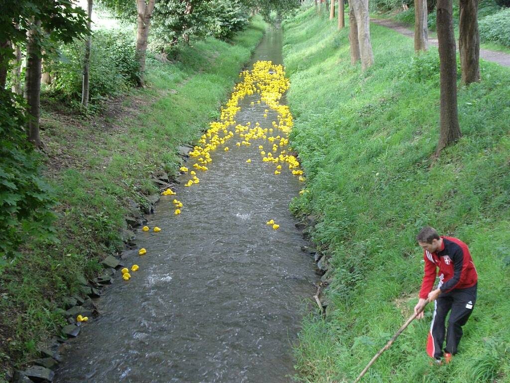 Beim 14. Entenrennen des SV-Blatzheim konnten die vielen gelben Plastikenten erst mit Verspätung an den Start gehen. Lange Zeit war unklar, ob der Start auf dem Neffelbach überhaupt durchgeführt werden konnte, denn im Neffelbach an der Löhrsgasse wurde ein Gegenstand gefunden, der einer Tellermine täuschend ähnlich sah.