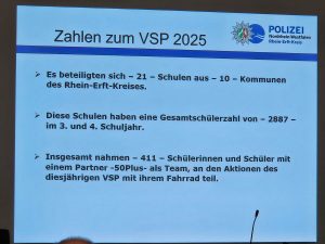 Die Kinder der dritten und vierten Klassen waren eingeladen, in Begleitung eines Erwachsenen im Alter Ü50 einen Fahrradparcours zu bewältigen, um sicherer auf dem Fahrrad zu werden. Die Maßnahme wurde von der Rhein-Erft-Kries-Polizei durchgeführt.