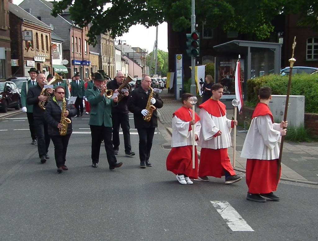 22 Kinder erhielten heute in der Pfarrkirche St. Kunibert ihre erste heilige Kommunion. In feierlicher Prozession zogen die Erstkommunionkinder begleitet von der Schützenbruderschaft, der Musikkapelle sowie den Messdienern und Katecheten vom Kunibertus-Haus über die Dürener Straße zur Kirche.