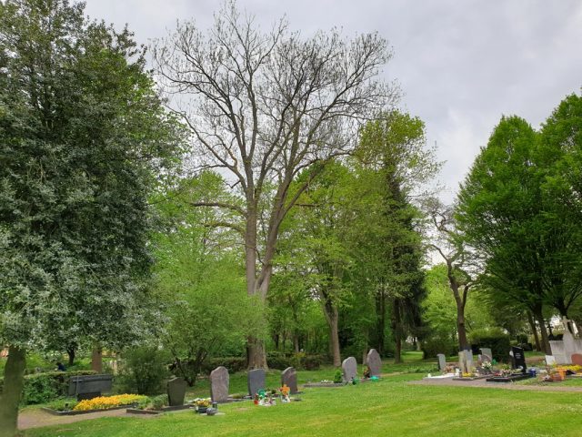 Eine sehr schöne, prägende Esche auf dem Blatzheimer Friedhof ist leider nicht mehr standsicher. Eine umfangreiche Untersuchung hat ergeben, dass Schäden durch Fäulnis und Pilzbefall am Stammfuß die Stand- und Bruchsicherheit nicht mehrt gewährleistet werden kann.