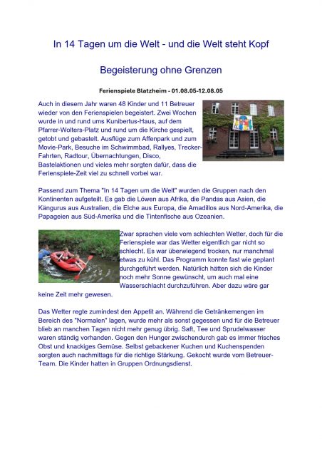 „In 14 Tagen um die Welt – und die Welt steht Kopf“ hieß das Thema 2005 und 48 Kinder sowie 11 Betreuer waren im Kunibertus-Haus dabei. Und die Begeisterung kannte in den beiden Wochen keine Grenzen.