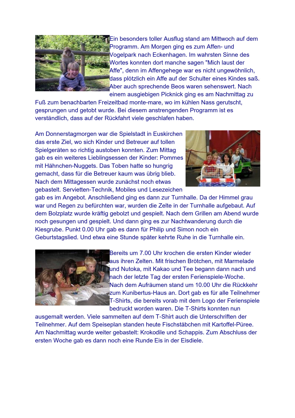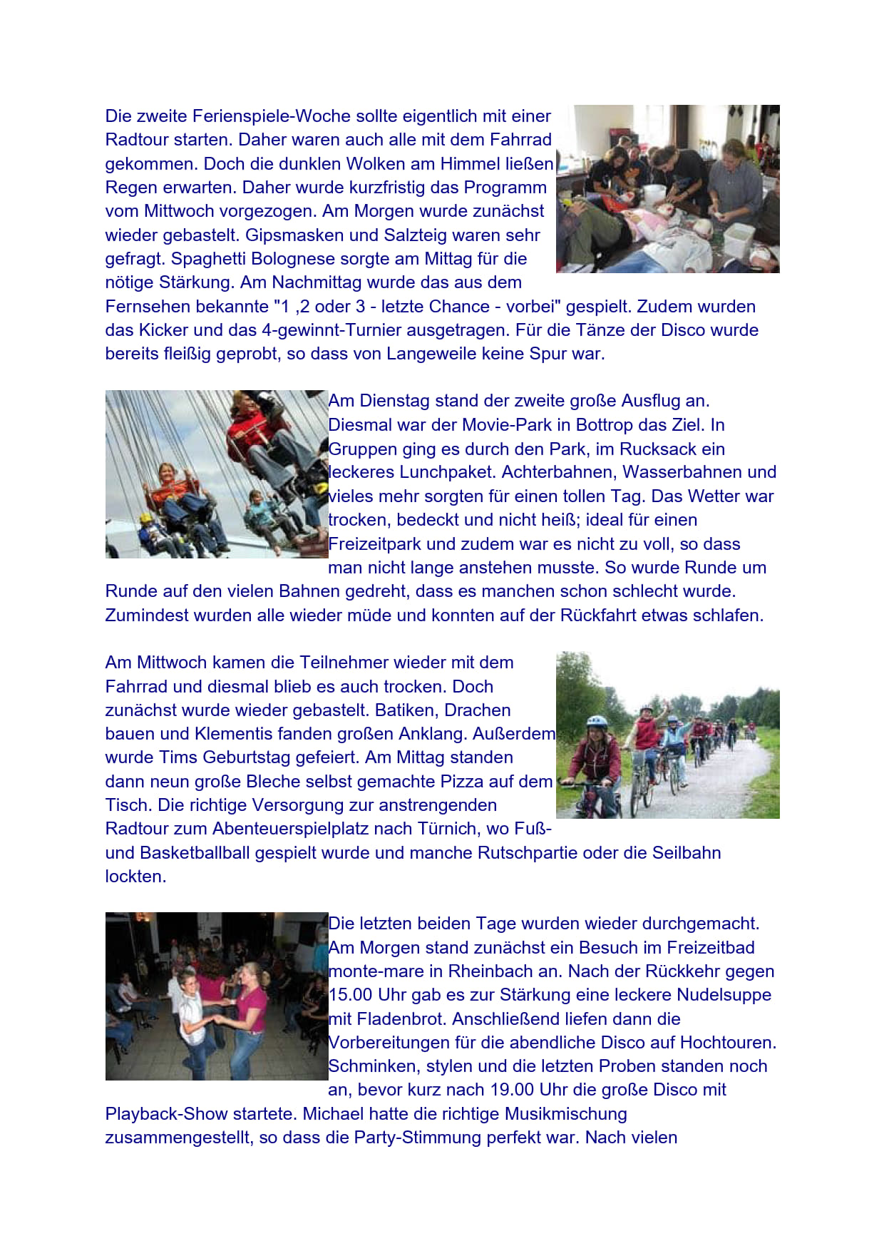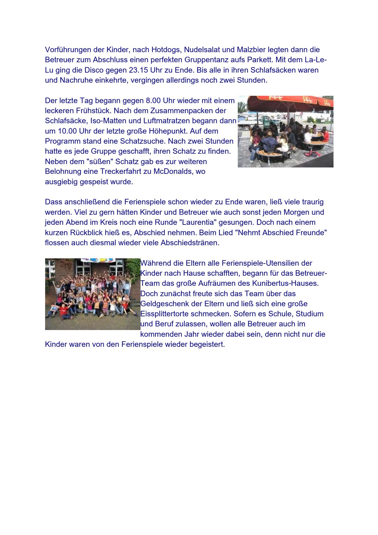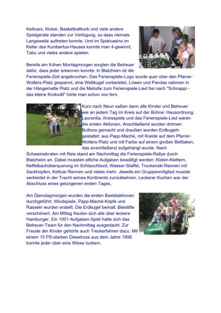 Rund um Kirche, Kunibertus-Haus und Pfarrer-Wolters-Platz gespielt, getobt und gebastelt. Viele unvergessliche Ausflüge und Aktionen wurden durchgeführt, teilweise in Gruppen, meistens gemeinsam. Es gab noch zwei Übernachtungen mit Nachtwanderung und der legendären Disco. Die Bilder zeigen, es war unbeschreiblich.