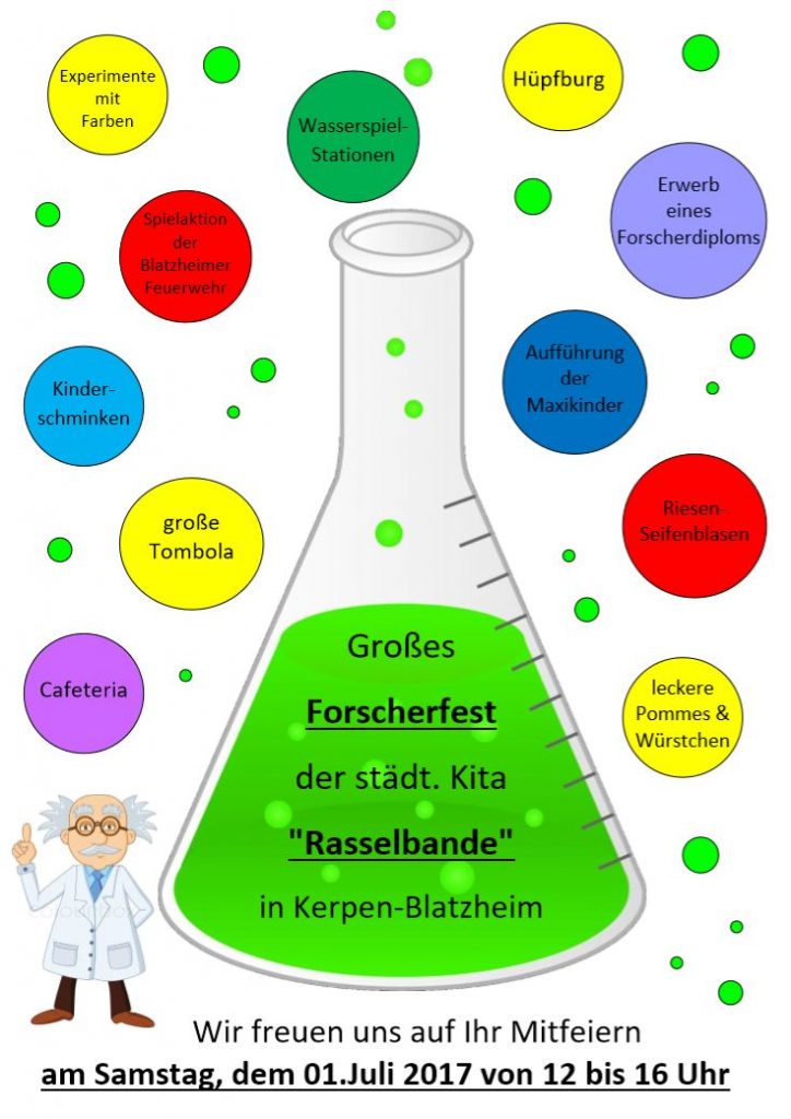 Unter dem Motto „Forscherfest“ gibt es viele Spielstationen für Kinder, so kann man das „Forscherdiplom“ erwerben oder an einer Spielaktion der Feuerwehr teilnehmen. Auch für das leibliche Wohl ist bestens gesorgt.