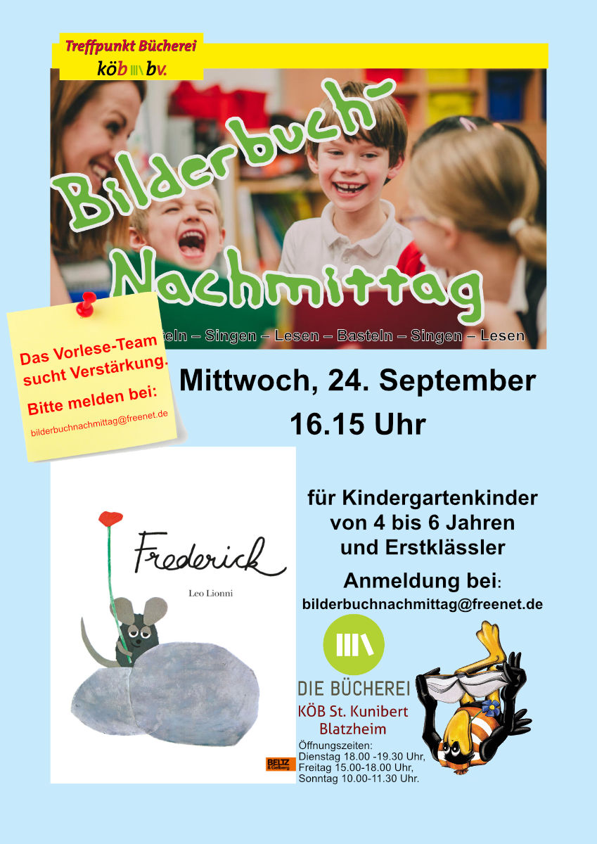 Am Mittwoch, 24.09.2025, findet um 16.15 Uhr der nächste Bilderbuchnachmittag in der Blatzheimer Bücherei statt. Diesmal steht das Buch „Frederick“ von Leo Lionni für alle Kindergartenkinder ab 4 Jahren bis einschließlich 1. Grundschulklasse im Vordergrund.