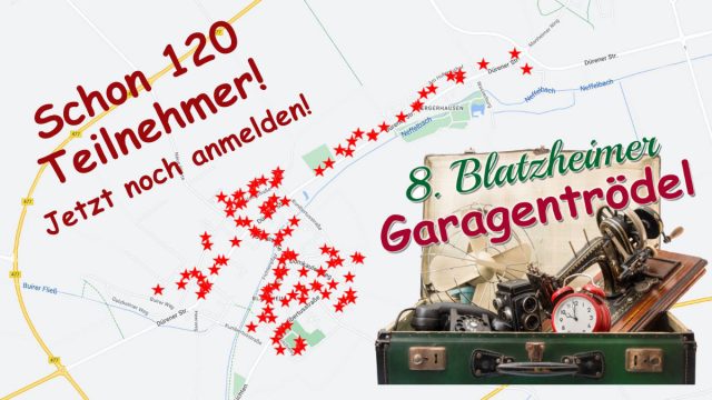 Der Blatzheimer Garagentrödel wird wieder ein Erfolg. Aktuell liegen schon rund 120 Anmeldungen vor. Bis zum 16. März sind noch Anmeldungen möglich, um auf das gedruckte Straßenverzeichnis zu kommen. Danach kann man sich auch noch anmelden und kommt das „nur“ noch ins digitale Straßenverzeichnis auf der Homepage.