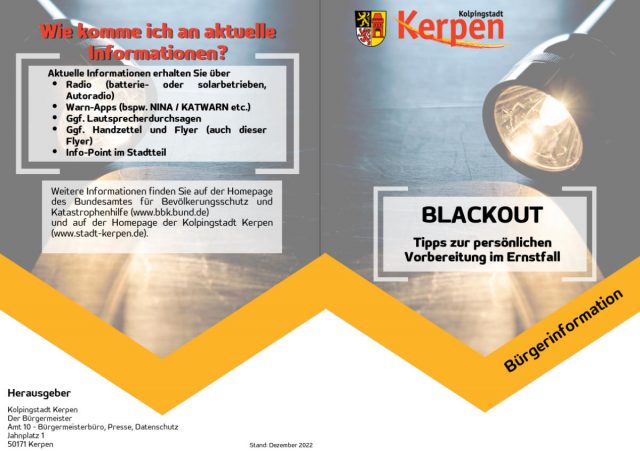 Zwar gibt es aktuell keinen konkreten Anlass, aber ausschließen kann es in Zukunft auch niemand. Die Kolpingstadt Kerpen hat einen Ratgeber erstellt, in dem kurz erläutertet wird, welche Folgen ein Blackout hat und welche Maßnahmen die Einwohnerinnen und Einwohner ergreifen sollten, um bestmöglich vorbereitet zu sein.