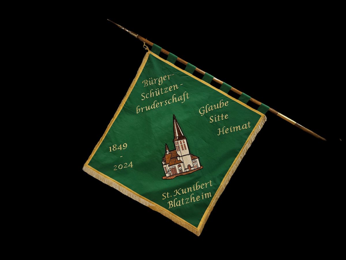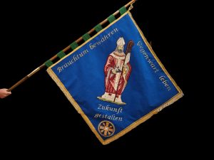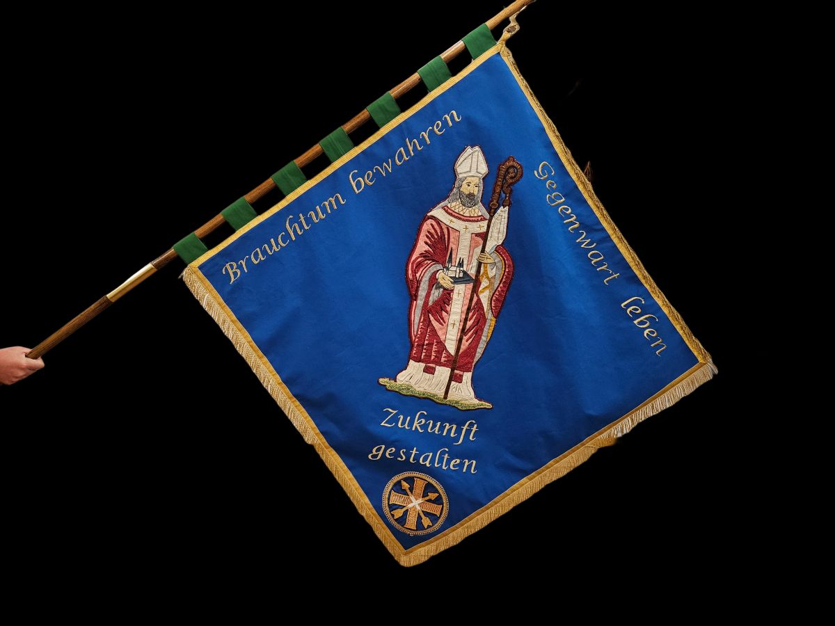 Im Laufe des Gottesdienstes segnete Präses Franz Josef Pitzen die neue Bruderschaftsfahne. Die alte Fahne hatte nach 30 Jahren zu viele Verschleißschäden. Die Abbildungen des Kunibert, der Kirche und das Wappen wurden von der alten Fahne übertragen. Neu ist der Spruch aus dem Jubiläumsjahr “Brauchtum bewahren – Gegegnwart leben – Zukunft gestalten.” Die neue Fahne wurde von Mitgliedern der Bruderschaft gespendet.