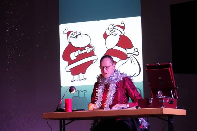 Alte Weihnachtspostkarten oder Werbeanzeigen wurden an die Leinwand projiziert und die Musik kam von alten Schellackplatten über sein mitgebrachtes Grammophon. Die Zuhörer erfuhren so, wie Weihnachten früher gefeiert oder auch missbraucht wurde. Darüber hinaus die Zuhörer auch etwas über die Entwicklung des Grammophons.