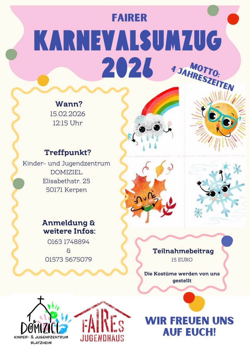 Am Karnevalssonntag nimmt das Kinder- und Jugendzentrum DOMIZIEL wieder am Karnevalszug teil. Das Motto lautet in diesem Jahr „4 Jahreszeiten“.