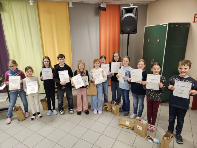 „Alle machten ihre Sache sehr gut und am Ende war es wieder mal ganz knapp“ sagte Tanja Scheuermann-Kettner bei der Siegerehrung. Für ihre Teilnahme erhielten alle Kinder einen Preis und einen stürmischen Applaus. Die Gewinner freuten sich zusätzlich über eine Urkunde und einen Buchgutschein. Die Gutscheine werden bereits seit Jahren von den „Buchstützen Blatzheim“ gestiftet. Vorsitzender Klaus Ripp, der als Leiter der Bücherei ebenfalls in der Jury war, durfte die Preise überreichen und lobte auch die Lesequalität der Schülerinnen und Schüler.