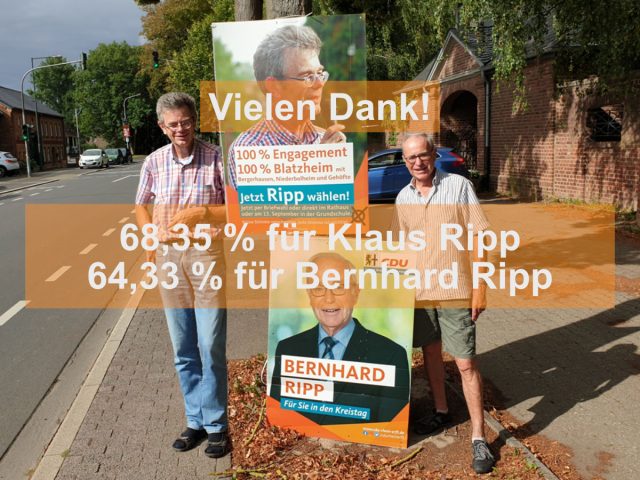 Mit 68,35 % der Stimmen ist Klaus Ripp Gewinner der Stadtratswahl in Blatzheim. Rechnet man den Stimmbezirk 8.3 (Bergerhausen) sind es für die CDU insgesamt in Blatzheim, Bergerhausen, Niederbolheim und Gehöfte 67,23 %.