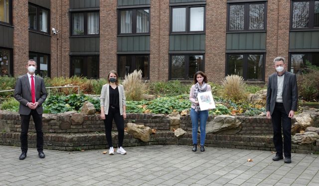 Die komm. Schulleiterin Judith Beerbaum nahm jetzt den Preis im Rathaus entgegen. Aufgrund der Corona-Bedingungen konnte die Preisverleihung nur im kleinen Kreis erfolgen. Im Beisein der Klimaschutzmanagerin Johanna Soboll, Ortsvorsteher Klaus Ripp überreichte Bürgermeister Dieter Spürck Scheck und Urkunde: „Das Projekt leistet einen wichtigen Beitrag zum Insektenschutz und damit zum Erhalt der Artenvielfalt. Zudem werden die Schüler, Lehrpersonal und Eltern sensibilisiert und für mehr Umweltbewusstsein im Alltag motiviert.“