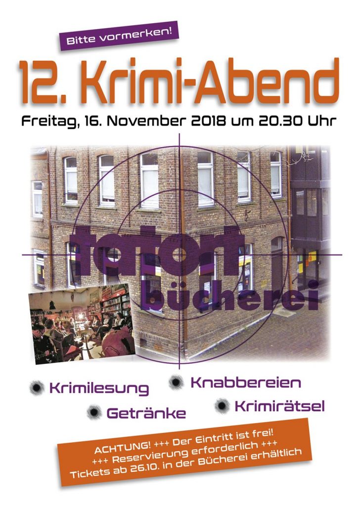 Wer auch bei der 12. Krimilesung wieder dem Geheimnis auf die Spur kommen möchte, sollte sich am Freitag, dem 16. November 2018 um 20:30 Uhr wieder in der katholischen öffentlichen Bücherei in Blatzheim einfinden. Team-Mitarbeiter der Bücherei tragen fesselnde und originelle Krimi-Kurzgeschichten vor und auch beim Krimi-Preisrätsel winkt wieder ein gruseliger Preis.
