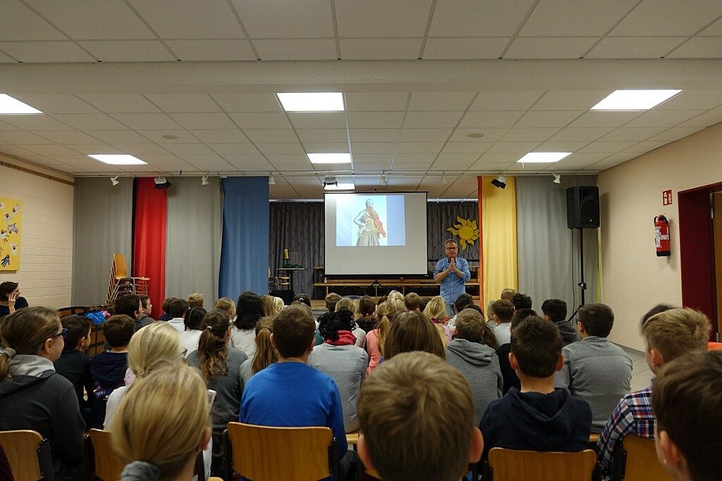 Der Autor, der mit 250 veröffentlichten Titeln (Die Zeitdetektive, Die Naturdetektive, F.B.I. Junior, Minecraft-Romane etc.) und weltweit 4 Mio. verkauften Büchern zu den erfolgreichsten deutschen Schriftstellern gehört, hatte für die jungen Leser das Buch „Barbarossa und der Raub von Köln“ aus der umfangreichen Reihe „Die Zeitdetektive“ mitgebracht und läutete die Lesung erst einmal mit einer kleinen Vorstellung seiner Person und die der Protagonisten ein.