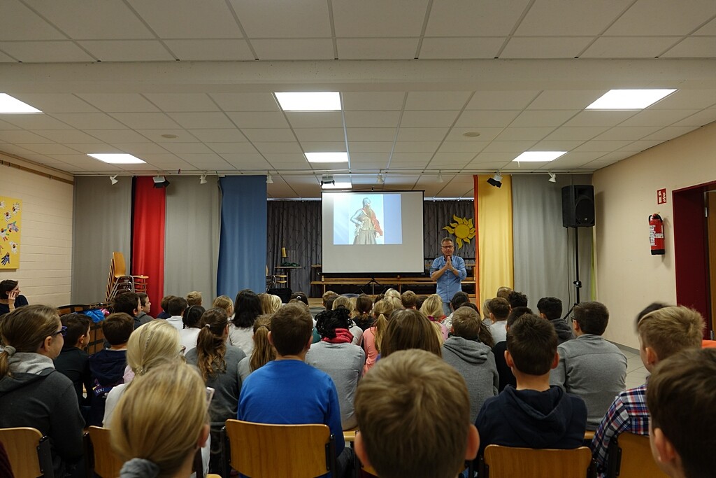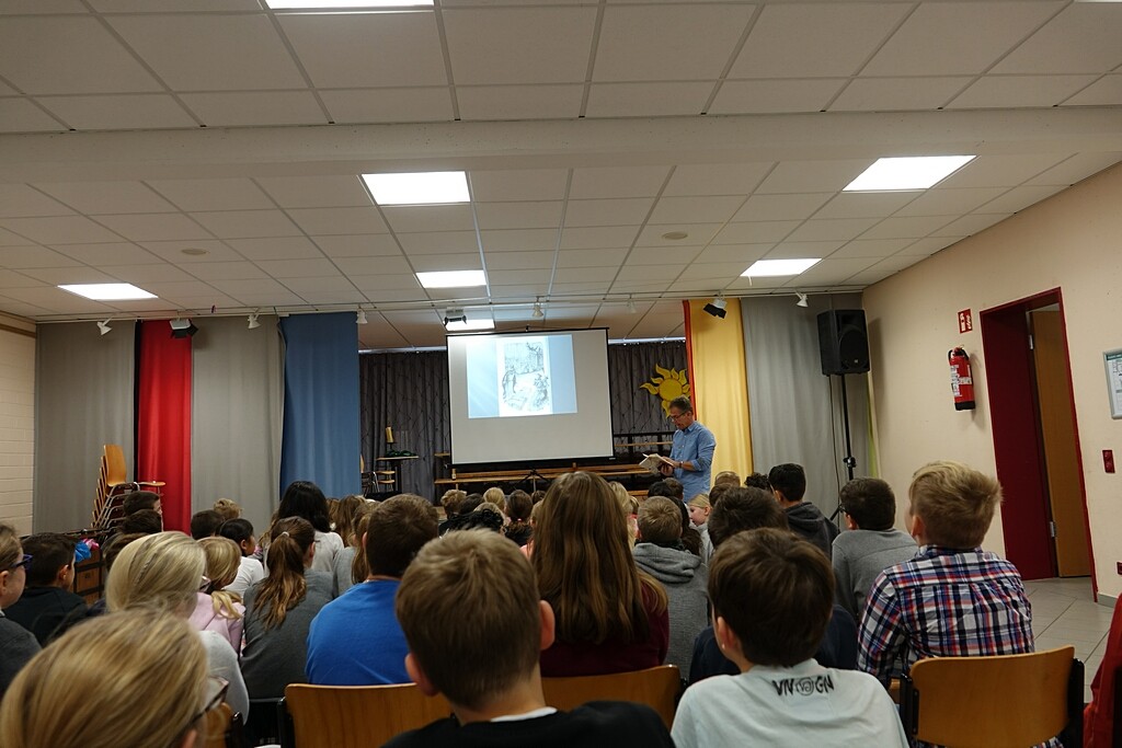 Bei der anschließenden Fragestunde durften die Schülerinnen und Schüler nach Herzenslust Fragen an den Autor richten und erfuhren so eine Menge z.B. über das Schreiben eines Buches, wie er sich auf das Schreiben vorbereitet (spielt Computerspiele wie z.B. Minecraft selbst!), wer seine Bücher testet (der Sohn!) und wer für die schönen Illustrationen seiner Bücher sorgt.