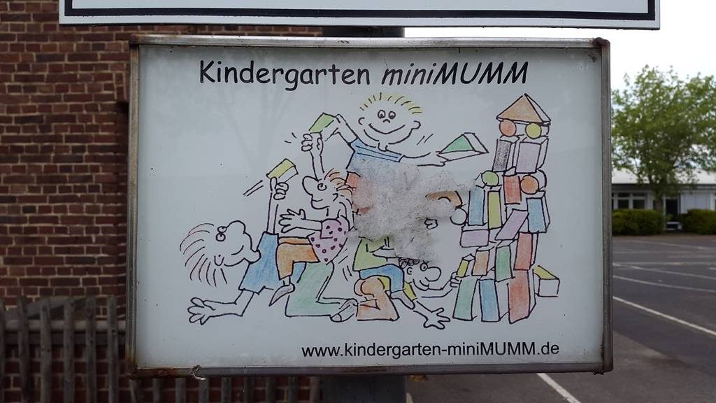 Ein Schild am Parkplatz der alten Grundschule erinnert noch an den privaten „Kindergarten miniMUMM“, der sich seit dem 01.08.2015 in die Trägerschaft des Lazarus-Hilfswerkes befindet und seitdem offiziell „Kindergarten in der alten Schule“ heißt.