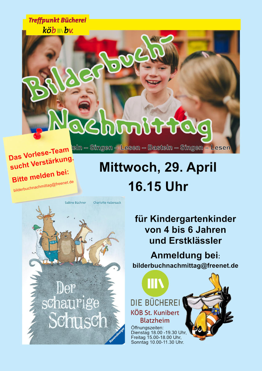 Am Mittwoch, 29.04.2026, findet um 16.15 Uhr der nächste Bilderbuchnachmittag in der Blatzheimer Bücherei statt. Diesmal steht das Buch „Der schaurige Schusch“ von Sabine Büchner und Charlotte Habersack für alle Kindergartenkinder ab 4 Jahren bis einschließlich 1. Grundschulklasse im Vordergrund.