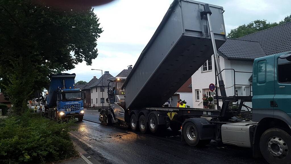 Am Samstagabend war kein Auto auf der Dürener Straße und auf dem Seitenstreifen von Bergerhausen bis zur Kommandeursburg zu sehen. Mit zwei Großgeräten wurde die Straße in voller Breite komplett neu asphaltiert. Um diese Arbeiten möglichst kurz zu halten, wurde die ganze Nacht durchgearbeitet.