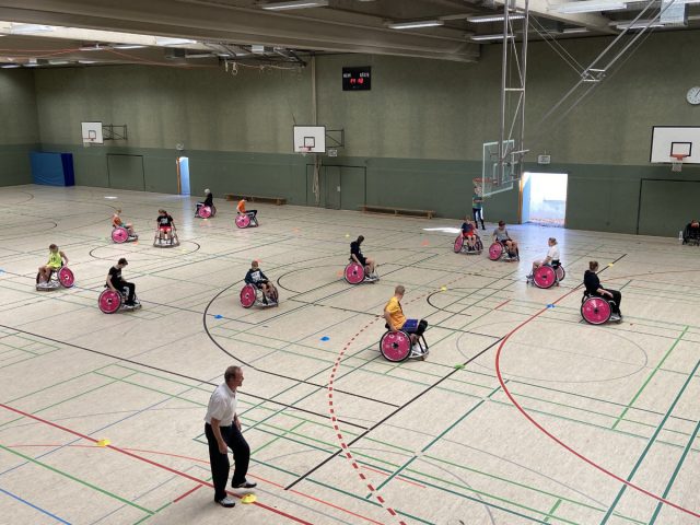 Sven Neeb, der selbst für die Cologne 99er in der Bundesliga der Rollstuhlbasketballer spielt, leitete die Übungsstunden. Zuerst mussten alle lernen, den Rollstuhl vorwärts und rückwärts, geradeaus und im Slalom zu bewegen. Danach kam der Basketball dazu. Im Sitzen ist es ganz schön schwierig, überhaupt bis zum Korb zu kommen! Zum Schluss wurde dann auf zwei Spielfeldern 5:5 gespielt, was erstaunlich gut funktionierte.