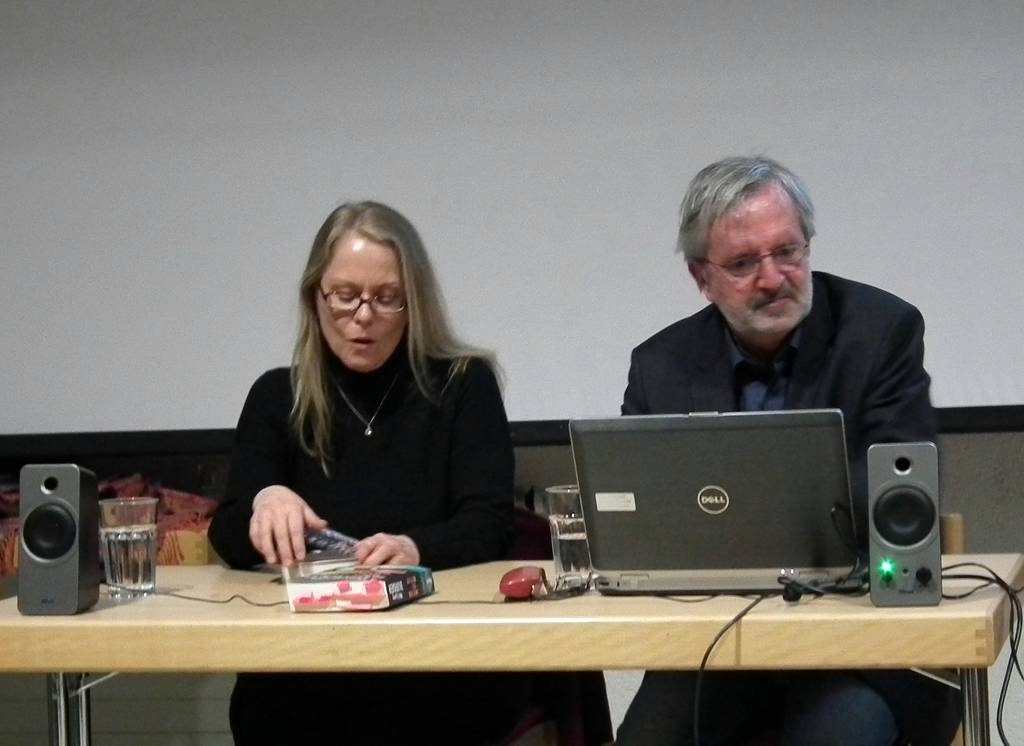 Und es gab noch eine Überraschung: Neben der „normalen“ Lesung gab es nach der Pause für das Publikum in Blatzheim eine Premiere, denn Wolfgang Burger hatte seine Ehefrau Hilde Artmeier mitgebracht, die selbst bekannte Krimiautorin ist. Gemeinsam haben sie erst im Februar ihren gemeinsamen Fall „Gleissender Tod“ herausgebracht. Im abwechselnden Rollen lasen sie unterstützt mit Bildern an der Leinwand und passenden Geräuscheinspielungen Szenen ihres Werkes vor. Das Publikum war begeistert.