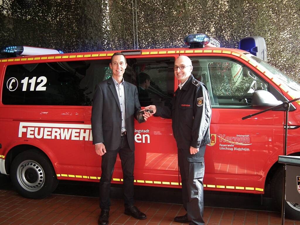 Über ein neues Fahrzeug freuen sich die Einsatzkräfte der Freiwilligen Feuerwehr Blatzheim. In einer Feierstunde vor dem „Tanz in den Mai“ übergab Bürgermeister Dieter Spürck offiziell das neue Mannschaftstransport-Fahrzeug (MTF) an Löschzugführer Dirk Durst.