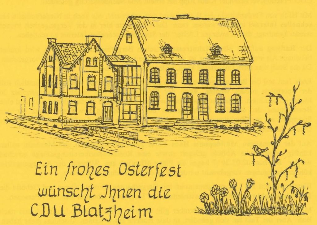 Mit ihrem aktuellen Osterrundschreiben wünscht die Blatzheimer CDU der Bevölkerung „Frohe Ostern“ und informiert über aktuelle Themen vor Ort.