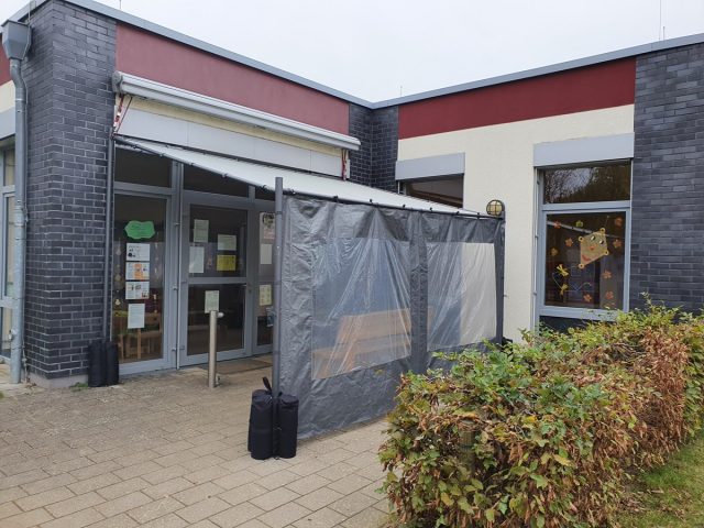 “Wir lassen unsere Familien nicht im Regen stehen”, sagte Corinna Steffens von der KiTa Rasselbande. „Mit zwei stabilen Pavillons, die hilfsbereite Väter aufgebaut und windsicher im Boden verankert haben, sind Eltern und Kinder auch bei der Bring- und Abholphase der Igel- und Mäusegruppe vor schlechtem Wetter geschützt.“